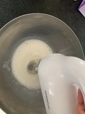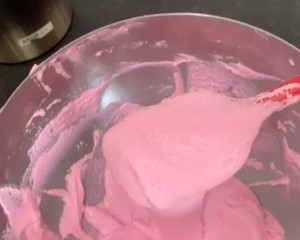 加入色素。中高档打发,到半干不湿的程度。比大弯勾硬一些。