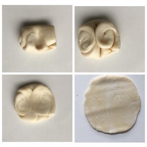 松弛完毕的面团中间用手指按压一下,两端向中间捏起来,然后用手压扁,擀面杖上下左右各擀一次。