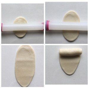 包好的面团用擀面杖从中间往上、往下各擀一次,从上往下卷起来。