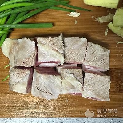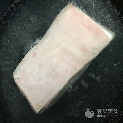 3、焯水捞出的五花肉切大块备用