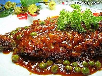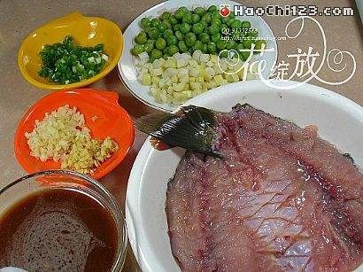 在鱼肉上抹上盐、料酒腌约二十分钟;豌豆煮软;笋尖稍煮后切小粒;葱、姜、蒜切碎;酱油、糖、醋、淀粉、汤或水同放在一个碗里调成滋汁。