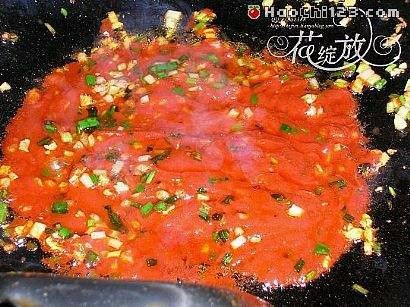 锅中放约一两油烧至五成热,改小火后下姜、葱、蒜末炒出香味,再下番茄酱炒约半分钟。加适量汤或水,沸后下肉末、豌豆、笋粒烧约半分钟,再勾入碗里的滋汁。