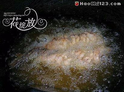 吸干鱼肉上的腌汁,再裹满干淀粉。锅中放油烧至七成热,将鱼花形在外,鱼皮在内卷成筒,如果鱼是剖成两半的,就分别卷筒,手提鱼尾,将油不断浇到鱼上,使鱼定型。