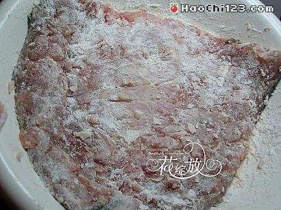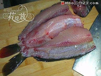 将鱼去鳞、挖腮、去头后,用刀从鱼的脊背正中对剖成两半(我没剖成两半,让鱼肚处相连,这样炸的时候一下就弄完)。剔去鱼骨和鱼剌,保留鱼尾。在鱼肉面斜切成荔枝形,不要切破鱼皮。