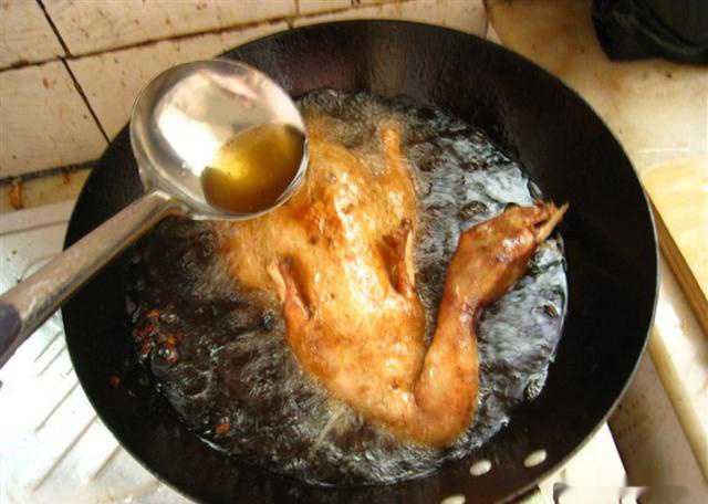 炒锅置旺火,放入花生油,烧至七成热,将鸭子皮抹匀酱油25 克,背面向上,下锅炸至金黄色时捞起。