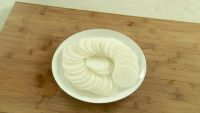 首先将白萝卜切片,摆入盘中。