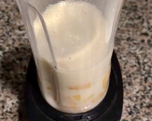 加入椰汁、牛奶、芒果粒、糖一起打成汁