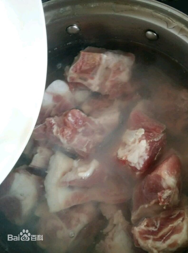重新打一锅水,水中放入姜片和排骨一起炖30分钟