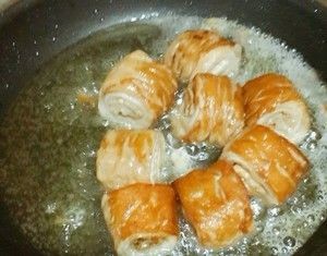 锅中入油和少许盐以免溅油。大肠下锅煎炸。每面都煎炸成金黄色即可捞出控油