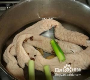 准备材料。买来的大肠用醋和面粉反复搓洗干净。锅中坐水,放葱姜,料酒,花椒去腥,大肠凉水下锅焯水。锅重新做水,加葱姜,花椒大料,生抽10克老抽和料酒,焯好的肠子入锅中煮熟。不要煮的太烂以免破坏它的形状,筷子能轻松插透即可。