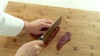 首先将牛里脊肉切大片,用刀背将两面拍松。姜拍扁,葱拍扁后切长段。