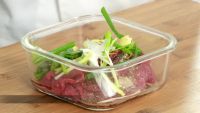 准备牛肉,放1勺盐,1勺黑胡椒粉,少量红酒,放入姜、葱拌匀,腌制20分钟。