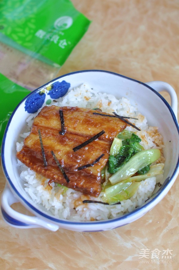 收汁后加入鸡精。炒锅里倒入油,将生菜炒软,出锅前加一点点盐。米饭焖好后,用铲子拌松散,盛入碗中,将炒软的生菜摆在上面。