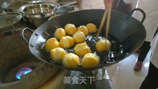 锅里放入大量油,烧至三四成热。鸡蛋面团糊用手像团丸子一样,将面糊团成一个个圆球,用勺子挖住,放进锅里