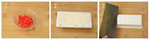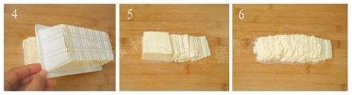 有空气进去后,用手很轻松的就可以把豆腐盒子取掉;刀上蘸水,切的时候不易沾豆腐。将豆腐切成均匀的小薄片,越薄越好,切完薄片,再将豆腐切成细丝,同样也是越细越好。