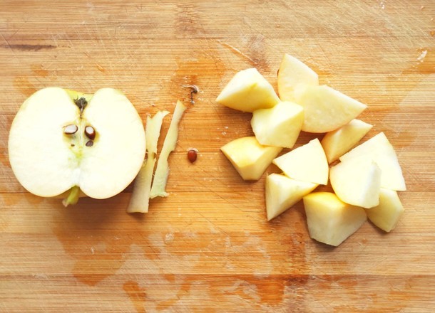 洗干净的苹果对半切开,取1/2去掉中间的果核,切块放入盘中备用。