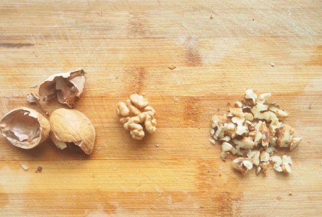 纸皮核桃用刀背杂碎核桃皮,取出核桃仁,用刀把核桃仁切碎,放入盘中备用。