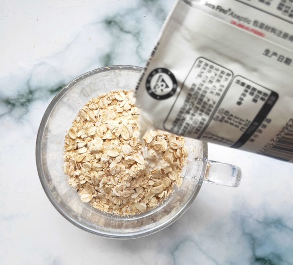 碗中倒入1/2的即食燕麦,倒入240ml的纯牛奶浸泡2-3分钟。