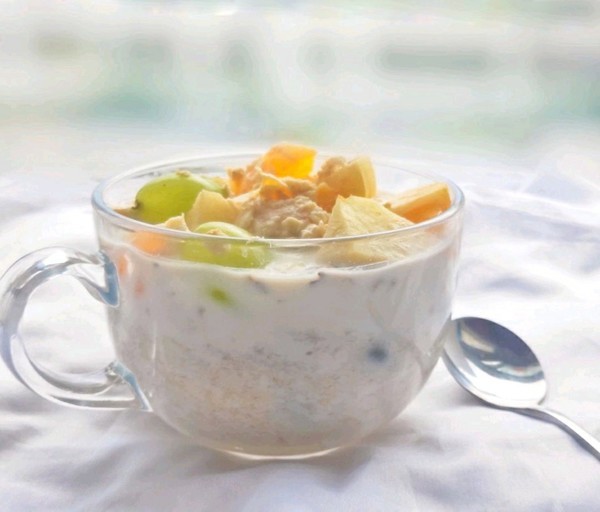 浸泡好的燕麦一次把切好的水果和核桃碎倒入燕麦,用勺子搅拌均匀即可食用。