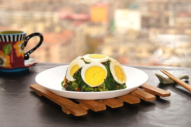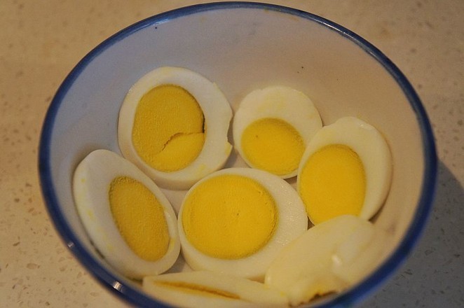熟鸡蛋去皮,用切蛋器切成片,取小碗码入鸡蛋片