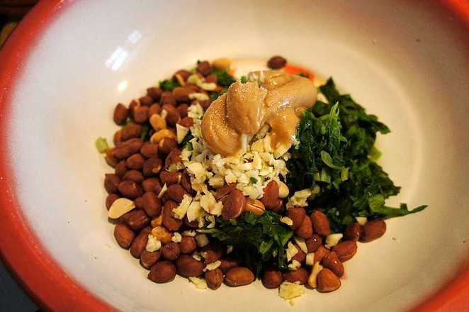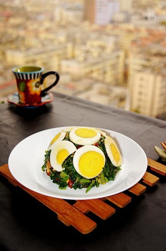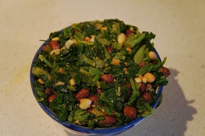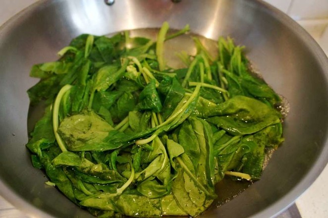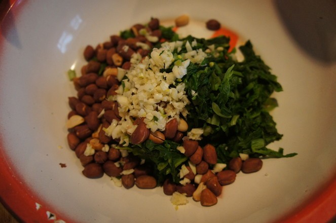 焯水的菠菜过冷水,攥掉水分切段,蒜去皮洗净切碎,取大盆装入所有食材
