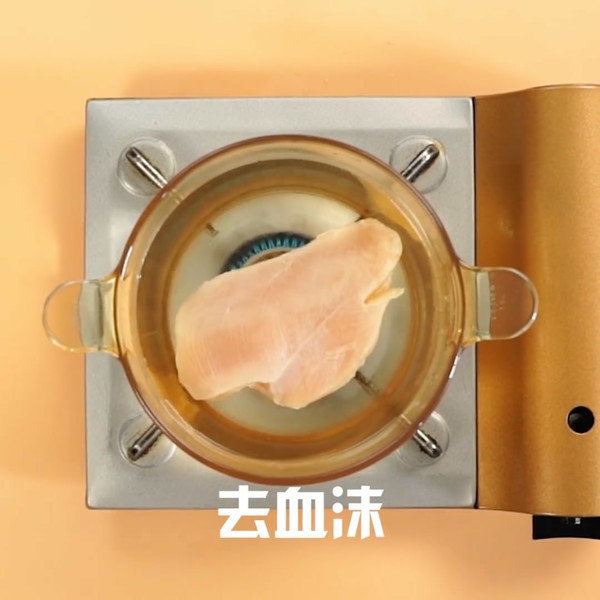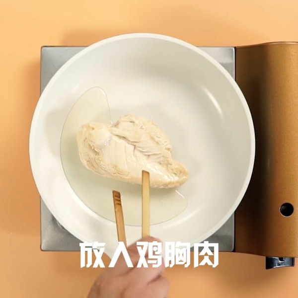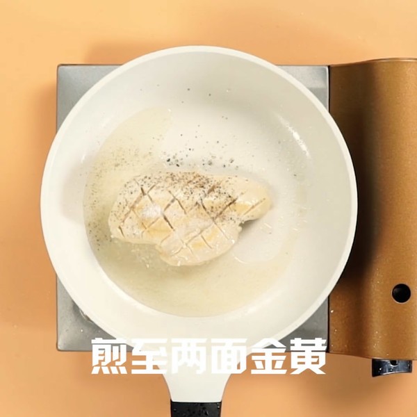 倒入食用油,放入鸡胸肉,煎至两面微黄