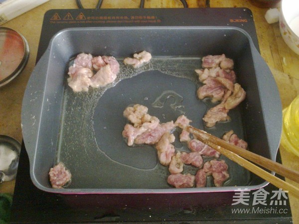 将肉捞出后,放入青椒翻炒到熟,盛出备用。猪肉切成块,均匀裹上干淀粉。锅里倒入油,把肉放入煎炸至表面金黄。