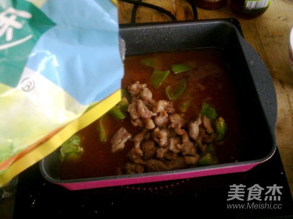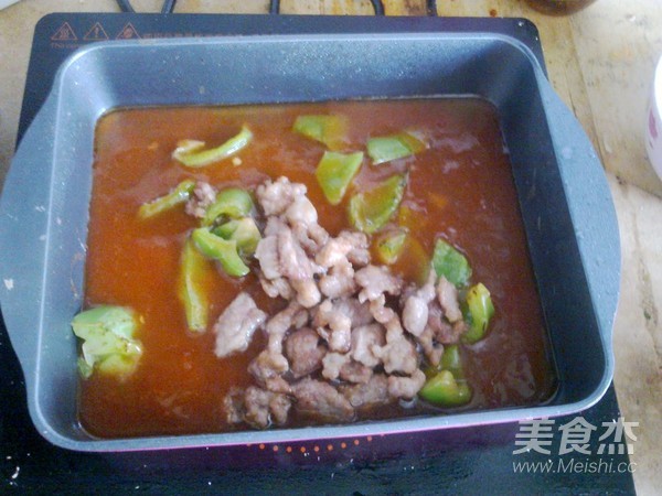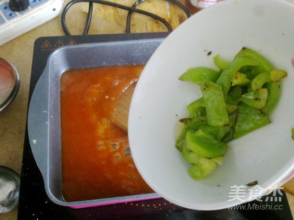 锅里留底油,放入糖和番茄酱,再加入适量盐。倒入少许水淀粉。熬煮到汤汁变得粘稠。倒入青椒。