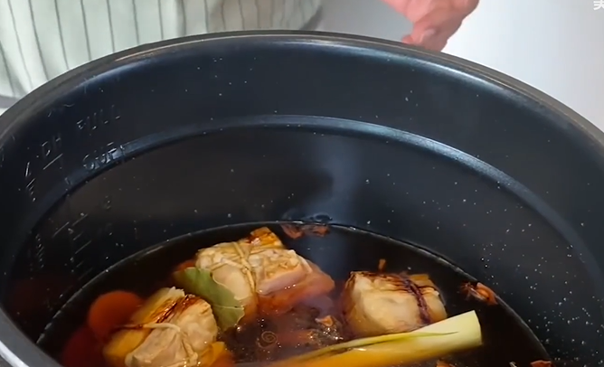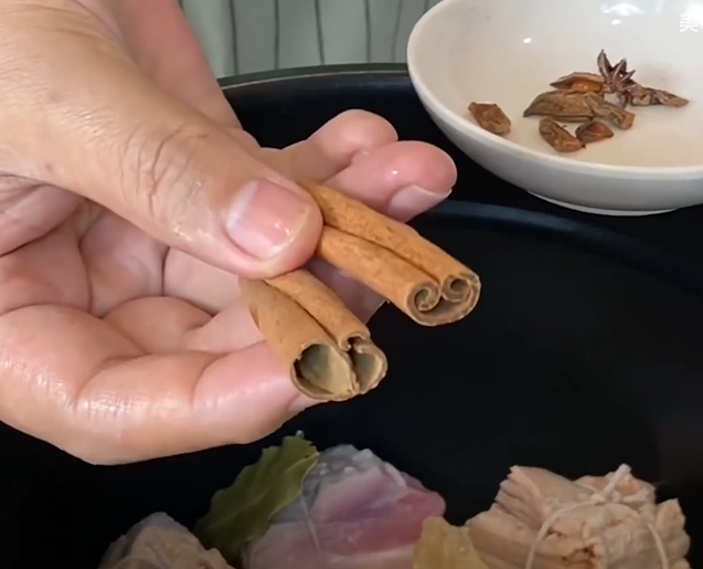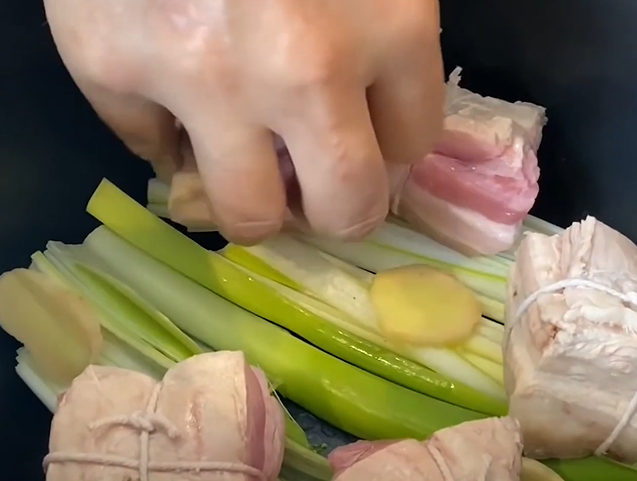 再放两月桂叶、八角茴香、250毫升料酒、盐、125ml老抽、4汤匙生抽,最后加入足够的水盖住猪肉即可。