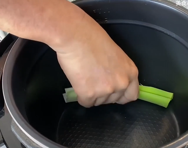 拿出电饭锅,大葱铺底