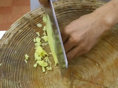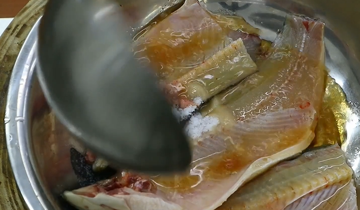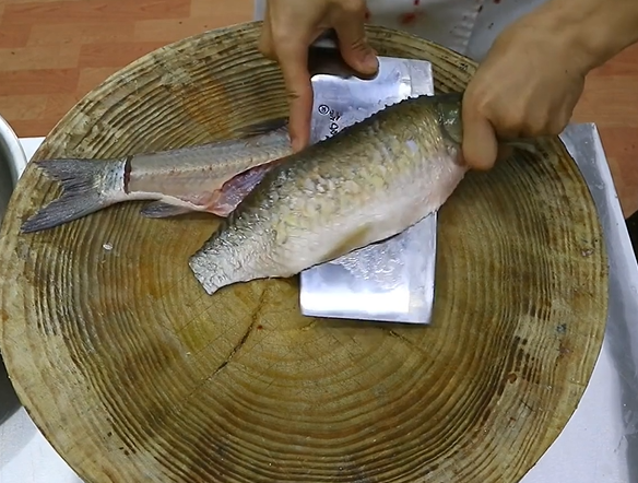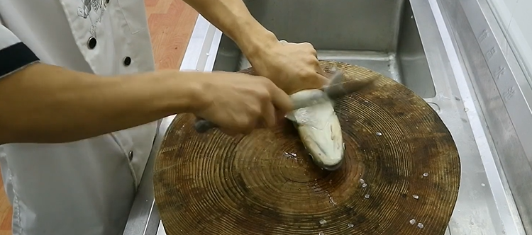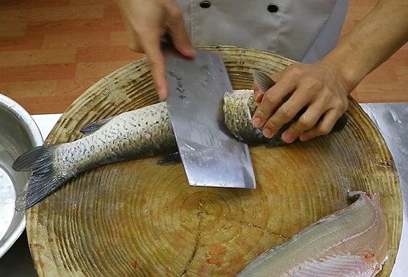 在带有龙骨的鱼身上每隔3厘米打上一字花刀。此为传统做法“七刀”之一。