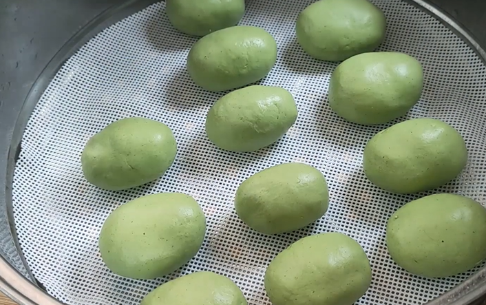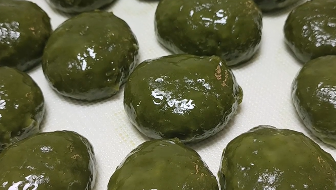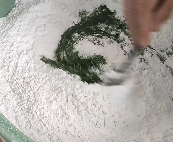 2斤糯米粉,200克淀粉,倒入艾草泥搅拌,期间加入150毫升食用油