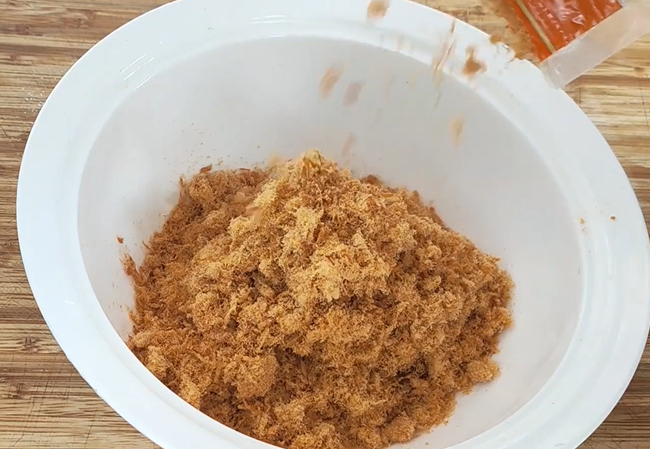 盆中倒入200克肉松、蛋黄碎、炒熟的白芝麻、搓碎的海苔、20克沙拉酱,搅拌均匀,