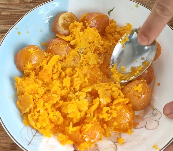 将整好的咸蛋黄压扁压碎
