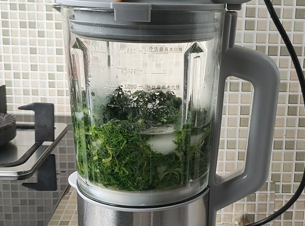将沥干的艾草放入破壁机,加入100克白糖,打碎