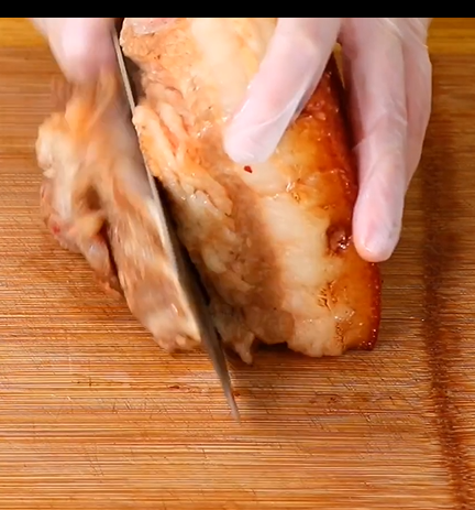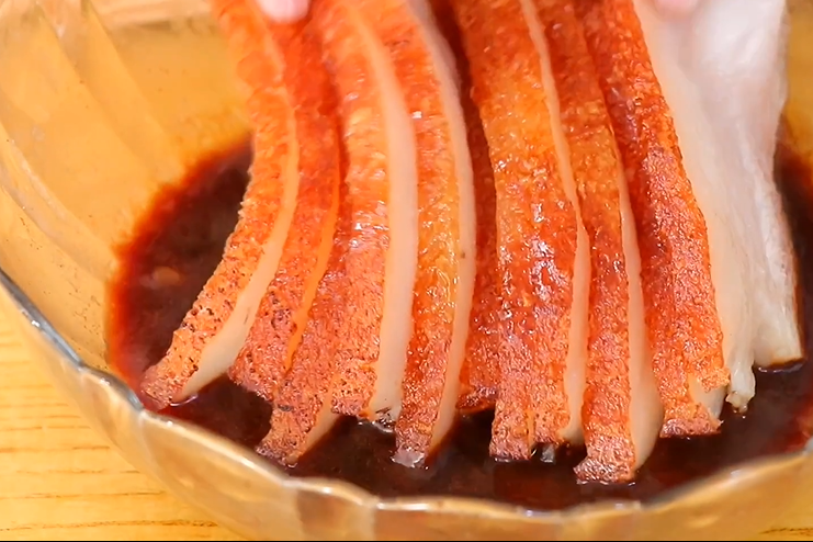 五花肉煮好后捞出,倒入酱汁,肉皮扎洞,将酱汁涂抹均匀