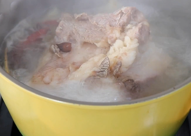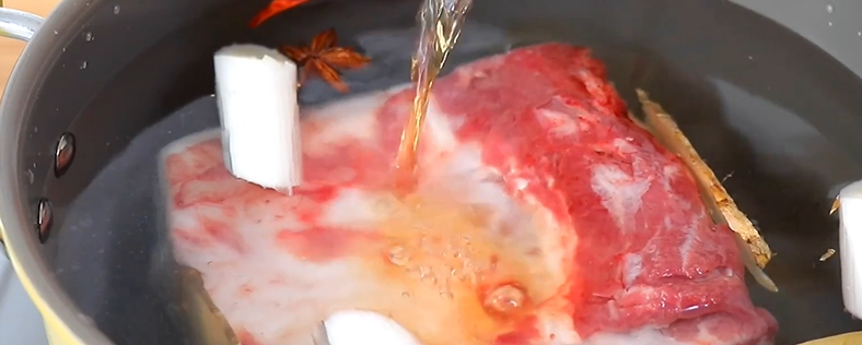 五花肉冷水入锅,加入葱姜、八角、香叶、干辣椒、料酒,煮30分钟