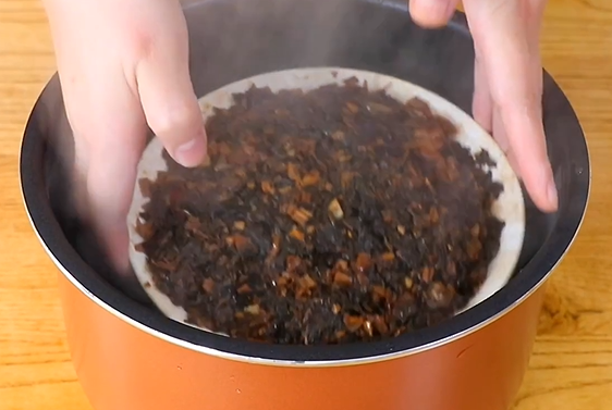 压好后取出,取盘子倒扣,翻过来,梅菜扣肉完成