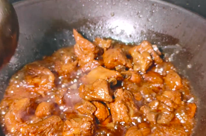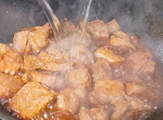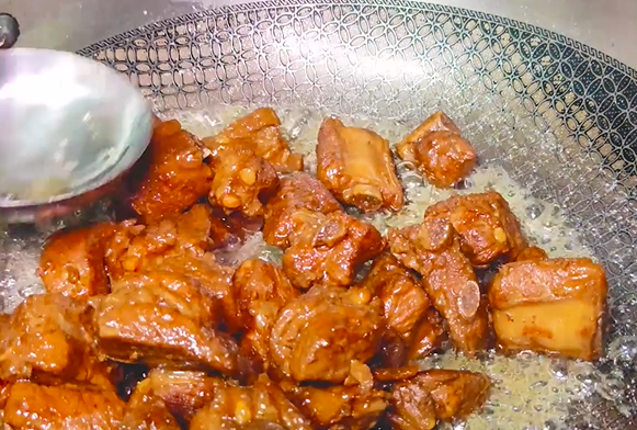 再淋上香醋,翻炒入味,再放入凉水,漫过排骨,大火烧开,中小火慢炖25分钟