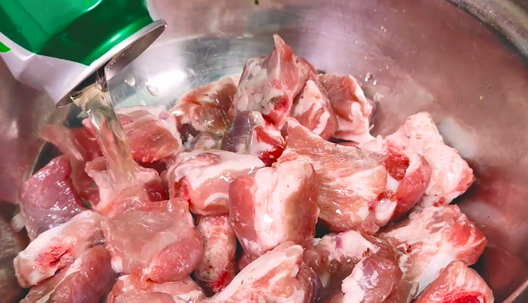 把排骨倒入盆中,用啤酒清洗一下,用手揉抓均匀