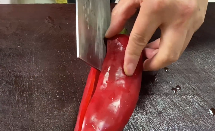 焖煮肉丸期间将大红辣椒去籽,并切成粒状