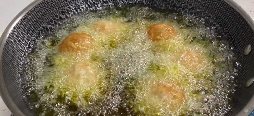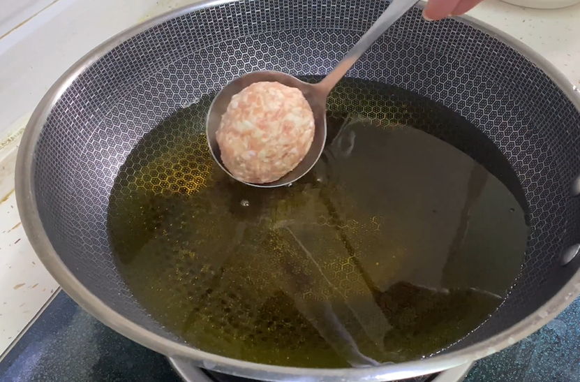 国内倒入色拉油,油温六成热时,放入肉丸子