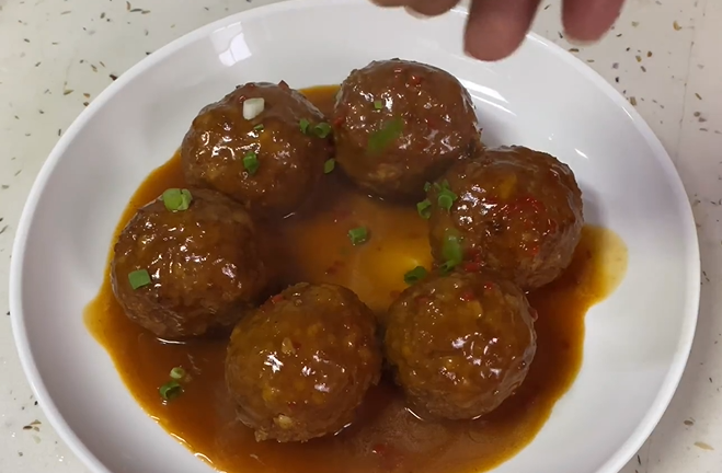 汤汁烧至浓稠,淋上肉丸,洒上葱花