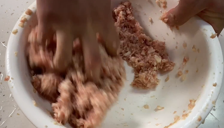 搅拌均匀,然后摔打至肉泥起劲