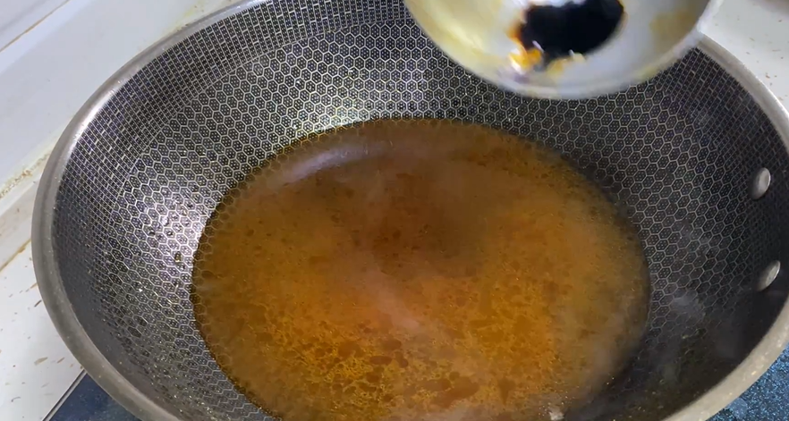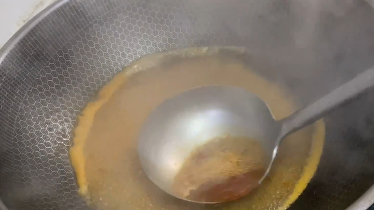 肉丸炸至金黄后捞出,国内留油,加入骨头汤、酱油和肉丸