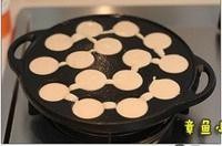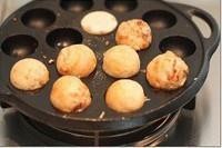用挑针将小丸子翻动一下,再倒入粉浆至满模,烤的过程中用挑针不停转动每个小丸子,令小丸子受热均匀,烤到整个小丸子金黄色,烤熟熄火
