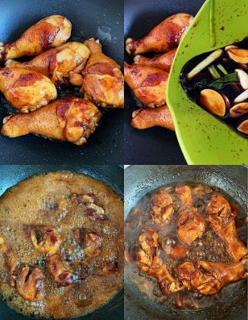油热鸡腿煎至两面金黄,淋入腌制剩余的料汁➕半碗开水没过鸡腿,大火煮开小火焖熟,收汁出锅