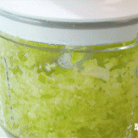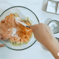 大碗里放入鸡肉糜、芹菜丁、洋葱丁、1小勺盐、2小勺糖、1大勺玉米淀粉和1大勺生抽