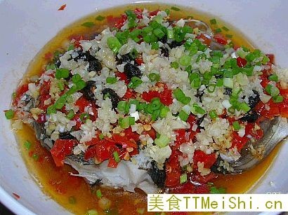 将蒜茸和葱碎铺在鱼头上,再蒸一分钟(正宗的做法是起锅后才放葱碎,我是为了能把葱的香味蒸进鱼头中才先放的)。