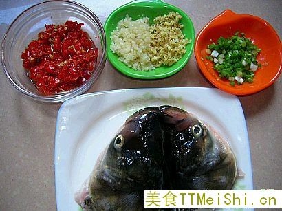 将鱼头洗净吹成两半,鱼头背相连,泡红椒剁碎,葱切碎,姜块切末,蒜半个剁细末。